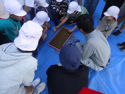 JA青年部の方の説明をしっかり聞き、丁寧に種まきをしていました。