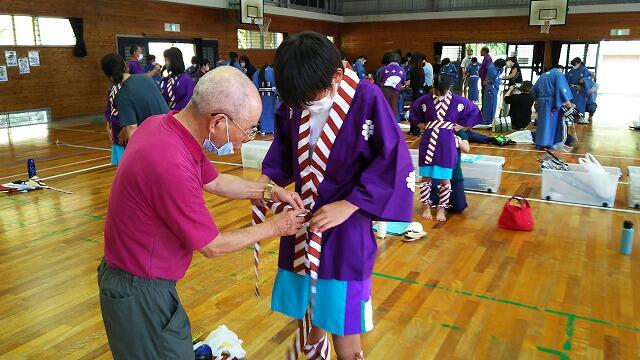 着物を着てからの踊りに不安がある、という児童の声から、急遽、木曜日の練習は着付けをして、いつも通り保存会の方々に踊りの指導をいただきました。雨のため、体育館での練習でしたが、着物を着るとやはり見栄えがします。当日が楽しみです。
