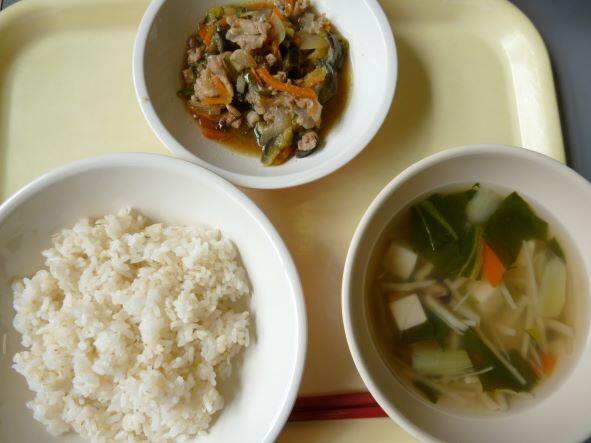 今日は、麦ご飯、中華風スープ、豚肉となすの味噌炒めでした。