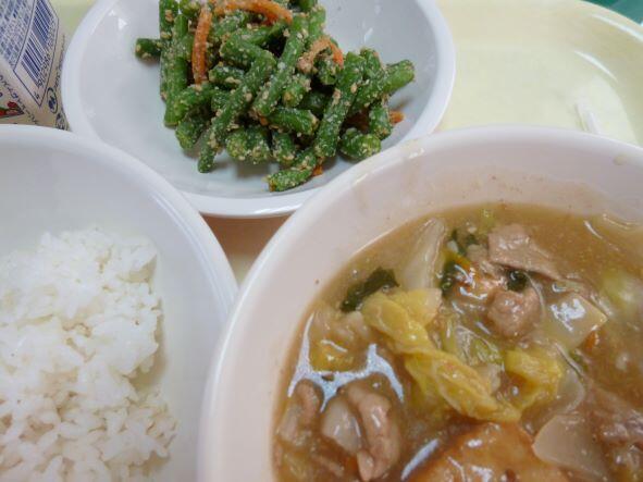 白菜のごま和えは、コーンも入っていて子どもたちも食べやすそうでした。