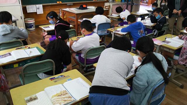 今日は、4年生が国語の授業を公開しました。「読んで考えたことを伝え合おう」という単元で、新美南吉さんの「ごんぎつね」を教材とする読み取りの授業でした。子どもたちは、友だちと考えを出し合いながら、ごんがどんなきつねなのかを深め合いました。「本当は、寂しいからいたずらをするんだ」「自分の存在に気付いて欲しいんだ」など、話合いで考えがどんどん深まっていきました。最後の音読では、読み取ったことを上手に表現できていました。