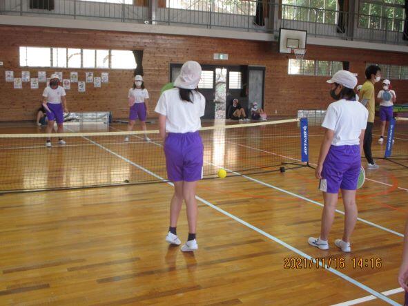 今日から、外部講師による一部学年体育の授業でネット型スポーツを体験します。初日の今日は、6年生が体育館にて受講しました。基本的なことを行った後で、ネットをはさんで2対2のゲームのようなものや、トスをテニスラケットで打つ練習なども行い、児童はとても楽しそうでした。