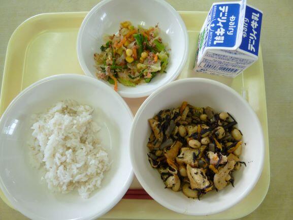 麦ご飯、磯煮、キャベツのおかか和え、牛乳