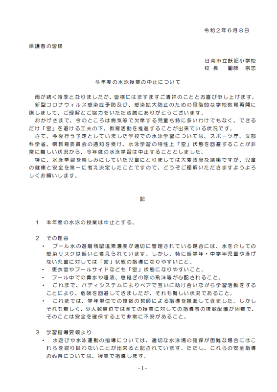 今年度の水泳の授業ですが、国及び、県、市教育委員会からの通知等をふまえ、実施するための対応が困難であること、感染のリスクがなくなったわけではないことから中止することとしました。下は、本日配付したそのことについての文書です。残念ですが、状況をふまえていただきご理解をよろしくお願いします。