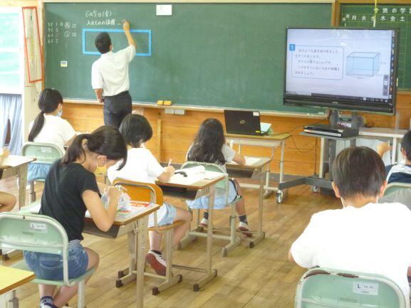 高学年の算数の授業です。学級を二つに分けて指導しています。黒板の青い枠には「その時間のめあて」を全学級かくことになっています。まとめの枠もあります。当たり前のことですが、めあてとまとめの整合性のある授業を推進しています。