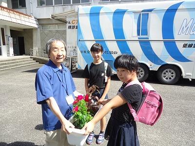 その腐葉土を使ってプランターに植えた花を贈る活動も行っており、今年度は、観光駐車場、小村記念館、飫肥公民館に贈りました。花を植えた栽培委員会の代表児童各2名が、直接出向き、観光駐車場と小村記念館の分は、城下町保存会の事務局長でもあり、小村記念館の館長でもある後藤さんに、飫肥公民館は、館長の井上さんに手渡しました。