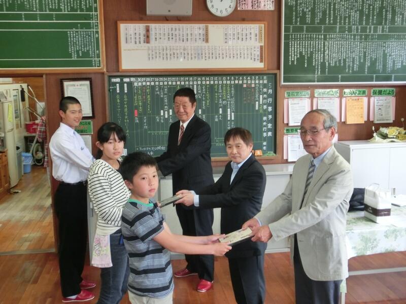 飫肥町づくり推進協議会の加藤正勝会長様、日南市泰平踊今町保存会の米良茂樹会長様、日南市泰平踊本町保存会の小玉洋一郎会長様から、本校児童6年新屋敷愛音さん、同じく6年川添珀くん、そして、飫肥中3年谷口太陽くんにDVDを贈呈していただきました。