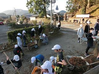 飫肥小学校は、昨年度から県の「地域と連携した環境教育推進事業」の環境教育推進校に指定されています。その活動の一環として、朝のボランティアで集めた落ち葉を使って腐葉土をつくり、その腐葉土を花壇やプランターの花の肥料として再利用しています。