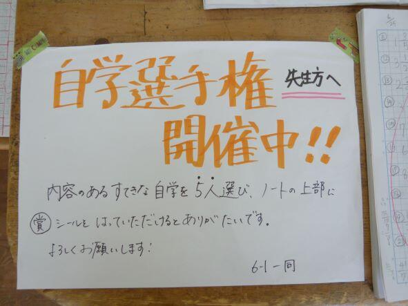 6年1組の廊下に自宅学習のノートが展示してありました。「何だろうと」見てみると、「自学選手権」だそうです。「よい」「工夫している」と思ったノートにシールを貼ってきそう取組のようです。級友の自学の様子もみることができる工夫した取組だと思いました。休み時間になると、児童が早速これらのノートを見ながら、シールを貼っていました。