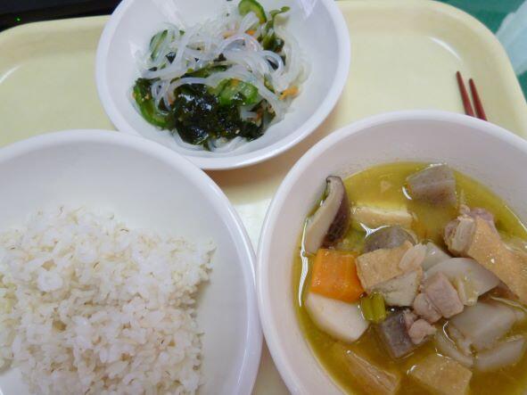 昨日の給食は「磯煮、千切り大根の酢の物、麦ご飯」でした。