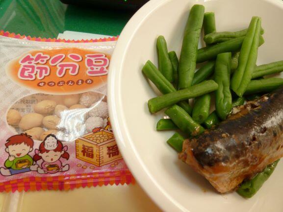 豚汁、いわしの梅煮、インゲン、麦ご飯、牛乳、節分豆