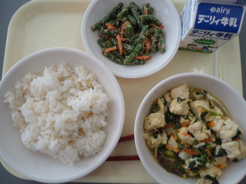 11月5日(木)の給食のメニューは、高野豆腐の卵とじ、いんげんのごま和え、麦ごはん、牛乳でした。