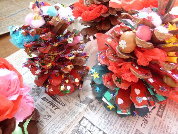 以前、1年生が保護者の方から大きな松ぼっくりをいただいていました。今回、それを使ってかわいらしいクリスマスツリーを作っていました。色紙やキラキラ光る小物を貼りながら、楽しそうに活動していました。