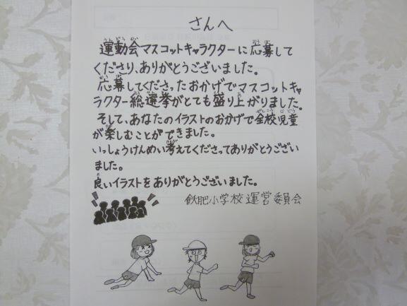 運営委員会の児童が、運動会マスコットキャラクターに応募してくれた児童向けのお礼状を作成し、配付してくれました。運動会マスコットキャラクターコンクール、この取組も、事前から運動会を盛り上げた取組の一つでした。玄関ロビーに掲示された数多くのキャラクターを児童一人一人が見て、「よい」と思うキャラクターに投票し、その結果、今年のマスコットキャラクターが決まったのです。今回、そのお礼状を作成し、応募してくれた児童一人一人に配付してくれたというものです。その細やかな心遣いに関心をさせられました。ありがたいしすばらしいです。