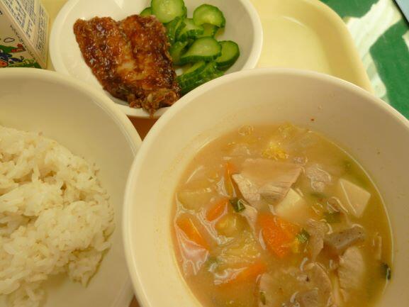 麦ご飯、牛乳、里芋のすり流し汁、鶏肉のピリ辛焼き、インゲン