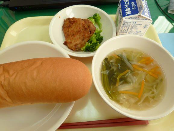 コッペパン、牛乳、野菜スープ、あげ豚肉のソース和え、ブロッコリー