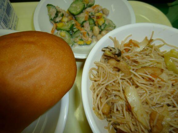 コッペパン、ビーフンの五目炒め、ツナとコーンのサラダ、牛乳