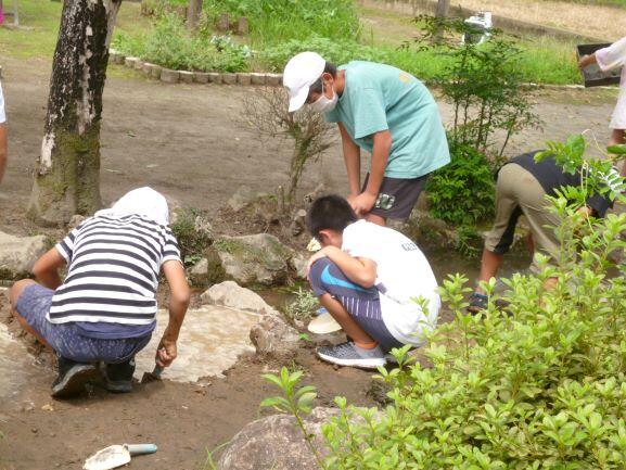 今日の昼休み時間も中庭の池周辺は賑わっていました。ただ、いつもと違って池の中を観察している様子はありませんでした。近くに行ってみてみると、五年生の男子が土の部分を掘って池のようにして遊んでいました。無邪気に楽しそうに遊んでいました。近くの蓮は変わらず可憐な花を咲かせていました。