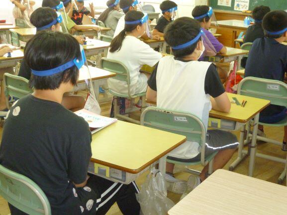 昨日、全校児童にフェイスシールドを配付しました。特に声を出す授業や英語の時などに使用してもらいます。マスクに比べると暑くないです。ただ、マスク着用期間がかなり長くなっているので、慣れるまでは違和感が大きいかもしれません。個人持ちで、ビニールも一緒に配付していますので、使わないときはそれに保管することになります。