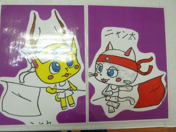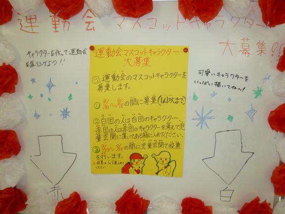 昨年に引き続き、運動会のキャラクター募集が始まりました。これは、運動会に向けてより盛り上がるための委員会の取組で、全校児童からキャラクターを絵に描いて募集、投票によって決定する、と言うものです。昨年度は、下の二つが白・赤それぞれのキャラクターに決まりました。玄関ロビーにそのための掲示物等が準備され、昼の放送でも流れました。今年は、どんなキャラクターに決定するのか楽しみです。