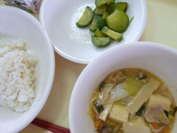 たたききゅうりは、児童にも職員にも人気のメニューの一つです。輪切りのキュウリが醤油、にんにく、砂糖、みりんなどで味付けしてあります。写真は低学年の給食ですので少なめです。