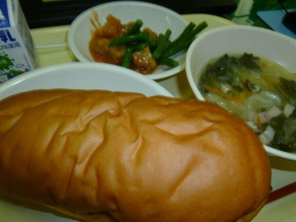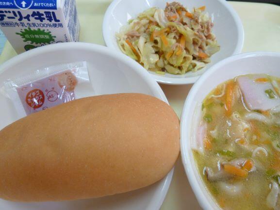 黒糖パン、野菜スープ、魚のオーロラ煮、牛乳、インゲン
