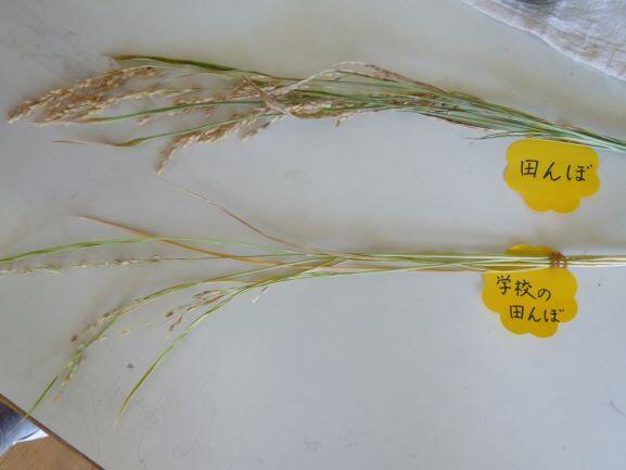 23日に5年生が稲刈りをしたことは先日お知らせしましたが、下の写真の違い、田で育ったいねと学校の中庭の狭く日当たりのあまり良くない模擬田で育ったいねとの成長の違い、見事に分かりますね。5年の廊下に展示してありましたので写真を撮りました。