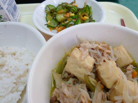 麦ご飯、牛乳、肉豆腐、昆布の酢の物