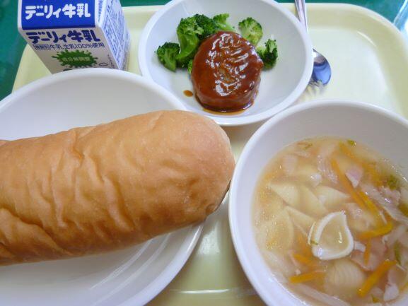 コッペパン、ミネストラスープ、煮込みハンバーグ、ブロッコリー、牛乳