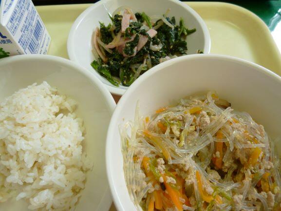 麦ご飯、牛乳、春雨スープ、豚肉のケチャップ炒め