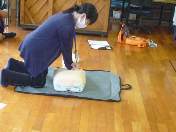 即活かすことが大切ですが、これについては、できたら活かさずにすませたいものです。予防に努めながらも、万が一の際には、指導いただいたことを実践しなければなりません。写真は、上半身のみの専用の人形に心臓マッサージをしているところです。全職員行いました。