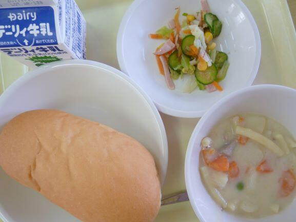 本日は コッペパン、マカロニのクリーム煮、りっちゃんのサラダ、牛乳