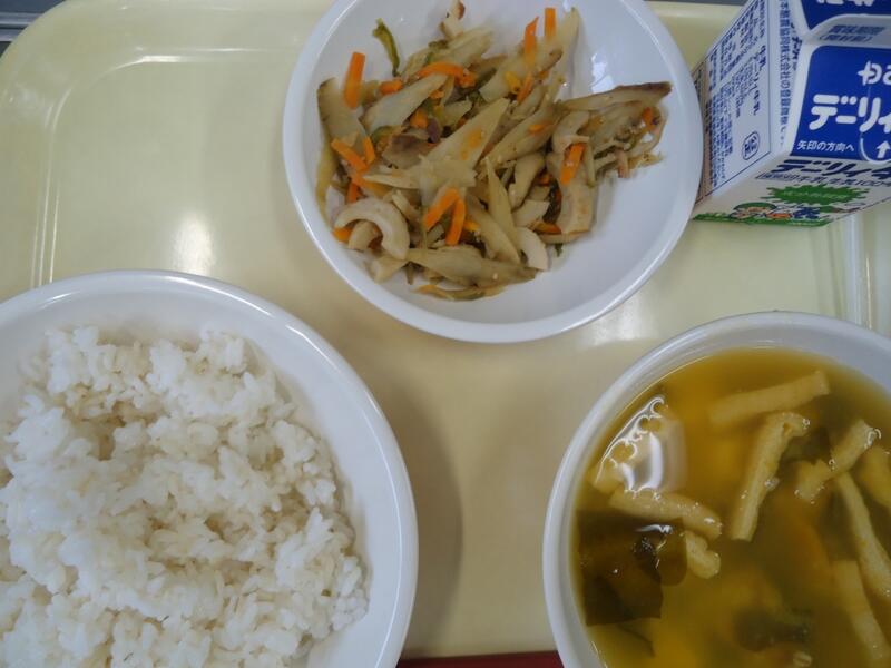かぼちゃの味噌汁、きんぴら、麦ごはん、牛乳