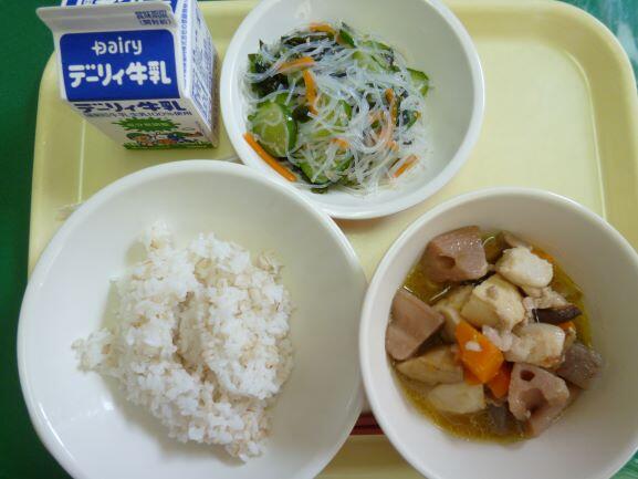 麦ご飯、牛乳、けんちん汁、おび天、きゅうり