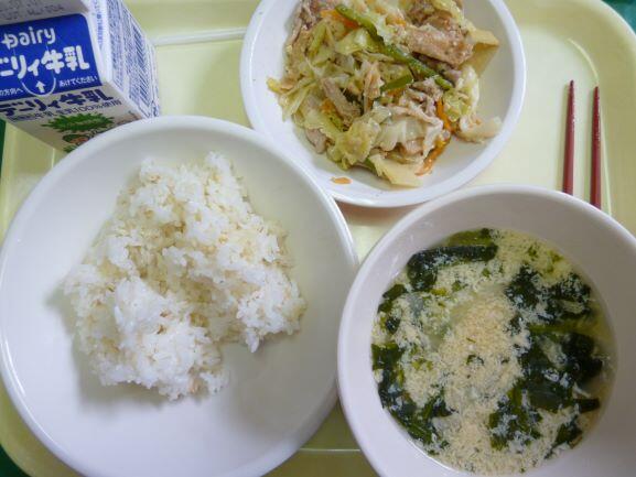 麦ご飯、回鍋肉、菠薐草のスープ、牛乳