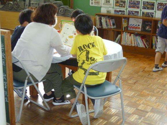 玄関ロビーには、写真のような新聞コーナーと談話コーナーをつくっています。新聞は、学校で取っている宮日新聞とその土曜日に入っています「宮日子ども新聞」を置いています。でも新聞を観る児童は、ほとんどいません。談話コーナーもしまってあったスクリーンなども立てて、少しだけスペースを確保しています。このテーブルは、児童が本を読んだり、勉強をしたりする姿が見られます。写真は、ちょうど職員が児童に読み聞かせをしてくれていたのを撮りました。