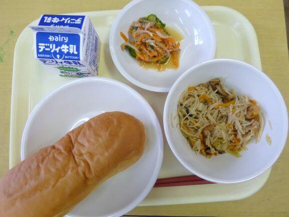 ミルクパン、牛乳、ビーフンの五目炒め、中華風和え物