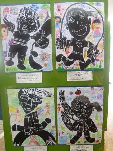 3-1の廊下側壁面に掲示してありました。ステンドグラスみたいでとてもきれいだったので写真を撮りご紹介します。ステンドグラスというと、宮崎空港に大変大きなステンドグラスがあります。影絵作家の藤城清治氏とステンドグラス工芸家の臼井定一氏の作品のようですね。この児童の作品は版画でありステンドとは違いますが、ステンドにしたとしてもすごく見栄えがするだろうなと言うような作品もあります。力作揃いです。