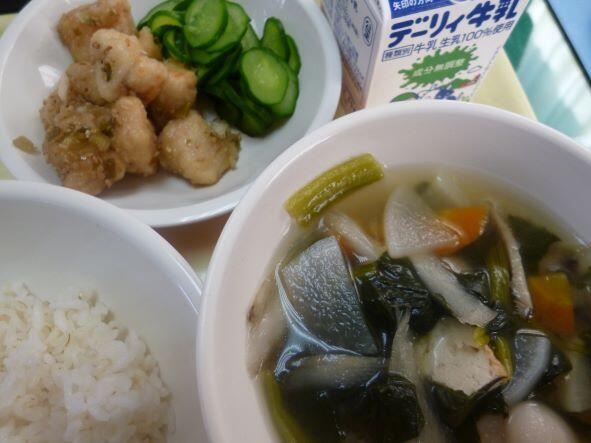麦ご飯、けんちん汁、魚のごま油和え、きゅうり