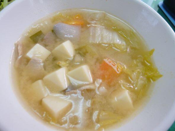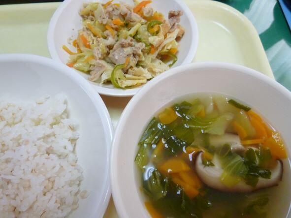 今日のメニューは「まる麦ご飯、五目豆腐スープ、回鍋肉」でした。