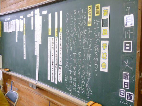 4年生が「自分たちの学級の旗をつくろう」をテーマにした話し合いをしていました。司会役、副司会役、黒板書記などの役を決めて、担任が補助する中で話し合いを上手に進めていました。多様な意見も出て、絞り込むのが難しかったと思いましたが、見事に予定したところまでは行き着くことができました。