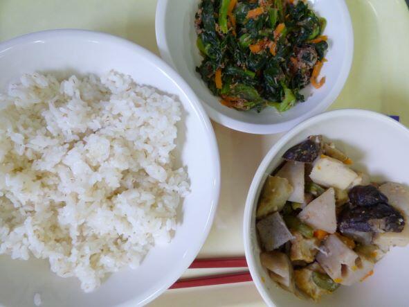 麦ご飯、鶏肉と里芋の味噌煮、白菜のゆず和え