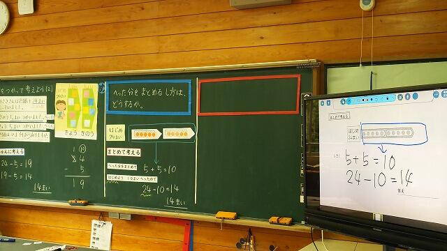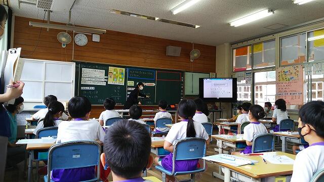 今日は2年生が算数の研究授業を行いました。子どもたちは、数図ブロックを操作したり、図に表したりしながら、文章問題に取り組んでいました。増えたり、減ったりする場面をしっかり理解して、分かっていることから、「まとめて考える」やり方を学習していました。式に表して、正しい答えが出たときの子どもたちの満足気な表情が印象的でした。