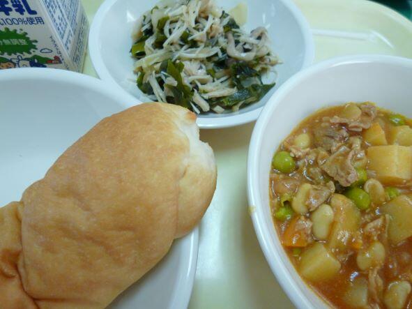 給食は「米粉パン、ポークビーンズ、キノコサラダ」でした。