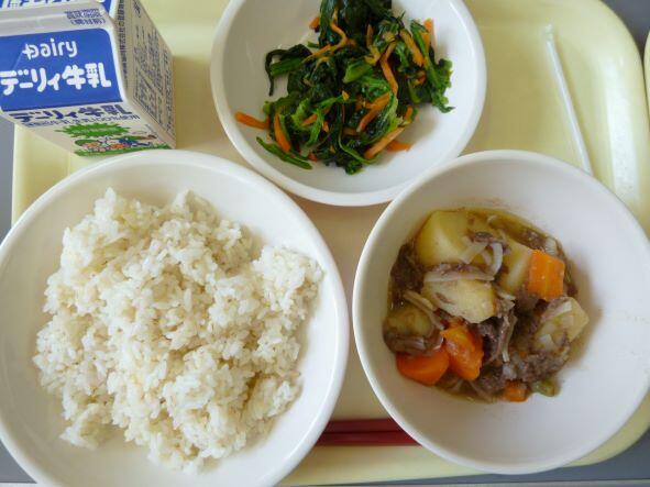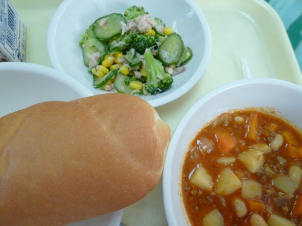 本日は、まる麦ご飯、ハヤシライス、大豆とツナのサラダでした。ハヤシライスは割とまろやかな味で、さっぱりしたサラダとの相性がよかったように感じました。今日も昼間は暑かったですね。昼休み時間、精一杯走り回った児童は、顔真っ赤、汗びっしょりでした。
