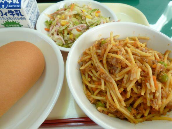 コッペパン、スパゲティーミートソース、りっちゃんのサラダ