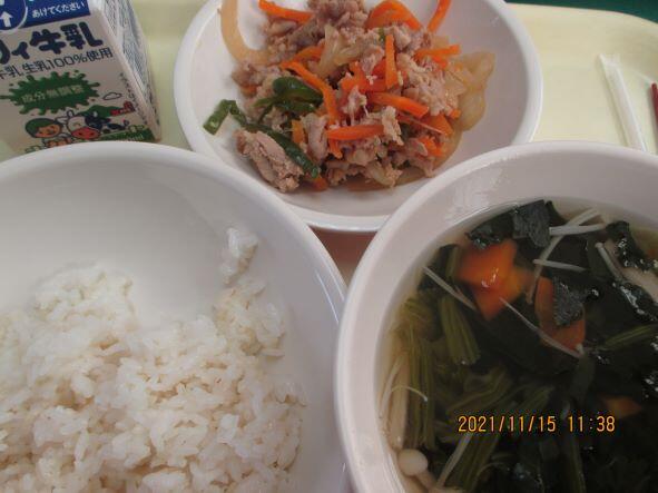 今日は、麦ご飯、中華風スープ、豚肉となすの味噌炒めでした。