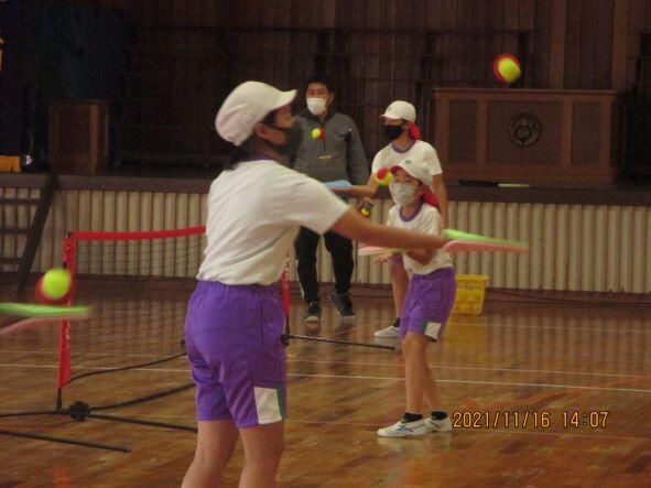今日から、外部講師による一部学年体育の授業でネット型スポーツを体験します。初日の今日は、6年生が体育館にて受講しました。基本的なことを行った後で、ネットをはさんで2対2のゲームのようなものや、トスをテニスラケットで打つ練習なども行い、児童はとても楽しそうでした。