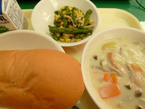 コッペパン、秋味シチュー、アスパラとチキンハムのソテー