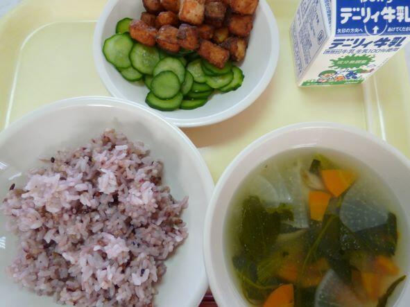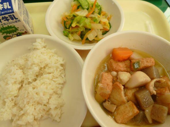 十二穀ご飯、のっぺい汁、カンパチの竜田揚げ、きゅうり